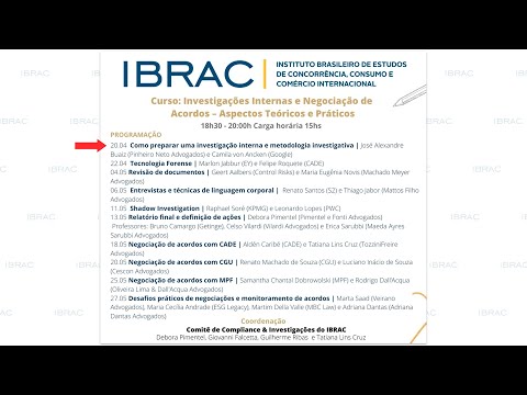 começa a investigação É também sobre um comparativo de verificação interna e externa as limitações que a gente vê em investigações internas que a gente sempre imprensa um pouco sobre a preservação de informações e documentos definição de escopo da investigação a privacidade de dados né GP de que é um tema bastante atual aí nessa em investigações ele vai falar também de gestão de crises um pouco é como administrar expectativas da administração muitas vezes de autoridades sobre uma determinada a investigação e falar um pouquinho sobre o que tem acontecido aqui de investigação na pandemia durante a pandemia