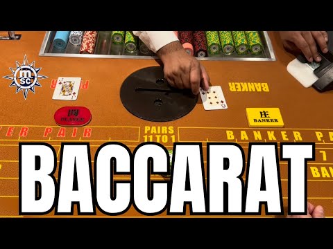 we're back with another one here on the MSC Seaside and check it out you asked for it it's baccarat and this is called the Super Six version am I right Andrew yes okay so what makes this game different uh unlike the other game we have two kinds of uh it's a commission Bara and Super Six Bara here in Super Six if Banker wins on six their bets base half okay all right so if the banker wins with six you get you get paid half yes okay [Music] all right we're gonna buy in and then we're done we're gonna buy in and we'll start with the action in just a moment all right so we have 100 red and 900 in Greens there is no Commission on this Baccarat and the only side bet that they offer here is pears which are 11-1 we're gonna we're gonna play that and then we're gonna play 50. what's that oh here here oh Ty's here and how much does Tai pays eight to one oh okay so we'll go pairs like that we'll start with that and we'll go Banker 50 bucks all right start later seven Bankrate Banger Wings natural lake okay it's okay so I'm gonna play uh adding a unit and hopefully following a streak here we'll put 10 on Banker pair all right let's Bangor Air Bud hey we need a card nice all right player wins Andrew's our dealer so we're gonna go over to player for 20 uh 50 bucks and we'll put 10 on the banker pair s five number three adjust the camera real quick here get a better shot a little tighter there we got a better shot so so far we've been uh Banker player Banker so it seems like it's going chop so we'll go 50 amp layer and we'll do 10 on the player pair all good summer bets y thank you five six Banker wins and six that's fair okay it's going Banker all right we'll go 100 on Banker we'll try to run the streak here and also uh five on the pairs oh all right we'll go back to player keep it a hundred little five on the pairs okay we got that one yeah all right we're going to do 125 on the player and we'll go five five and then five on the tie a little bit I haven't seen a tie yet there are Six Flags reports they're different cool Okay add another quarter so far no hairs and no ties so hello good win there all right we're gonna increase by 50 this time so we have 200 on the BET and we will just go pair pair 100 there was nothing okay oh and I didn't play it 50 more in red please so we're gonna we're gonna play the entire shoe somewhere between like uh like 65 and 70 hands is that about right Andrew yep all right cool so we are on hand number nine yeah good one there 200 win okay we will go to 250. and we'll bet the ciders that's that's my player that's three back or six third track right there seven two weeks nice seven number six big win there all right we're gonna add 50 we'll go to 300.