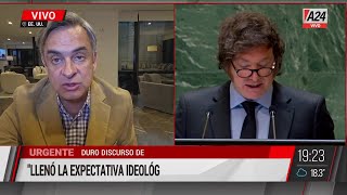 [Música] a las autoridades de las Naciones Unidas los representantes de los distintos países que le integran y todos los ciudadanos del mundo que nos estén mirando Buenas tardes para aquellos que no lo saben yo no soy político soy un economista un economista liberal libertario que jamás tuvo la ambición de hacer política y que fue honrado con el cargo de presidente de la república Argentina frente al fracaso estrepitoso de más de un siglo de políticas colectivistas que destruyeron nuestro país Esta es mi Este es mi primer discurso frente a la asamblea general de las Naciones Unidas