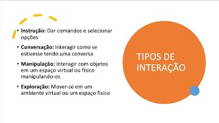 modos de interação eh e os tipos de interface que eu vou propor para esses modos de interação então o modo de interação é o que que o usuário faz quando ele interage com o sistema como a gente mencionou antes eu vou instruir o sistema eu quero conversar Esse é um tipo de interação eu quero navegar o que que eu vou fazer afinal de contas e os tipos de de interface né eles aqui são representados por diferentes estilos né de que que interface eu vou usar para apoiar esses modos de interação que são esperados do do