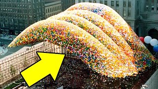 The target was two million balloons, but an approaching storm prompted an early launch and the total topped out at 1. 4 million. At 1:50pm on the 27th of September huge crowds gathered to watch the balloons be released.