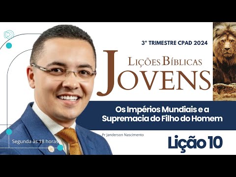chegamos hoje na lição de número 10 aqui da classe dos jovens texto escrito e comentado pelo pastor Valmir Nascimento essa lição qu é do terceiro trimestre da CPAD em 2024 tema da aula de hoje os impérios mundiais e a supremacia do filho do homem essa lição que vai cair no dia 8 de Setembro E é claro que você já pode iniciar sua ministração por algumas bases bíblicas que a própria lição já traz e oferece para você inicie a tua aula apresentando do texto principal que se localiza em Daniel Capítulo 7 Versículo 13 apresente também a