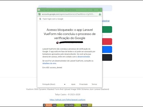 aqui na página e de configuração da da da autenticação aqui né do Serv de autenticação do Google então nessa tela de permissões aqui do off Então a gente vai perceber o seguinte ó ó o nome do aplicativo é esse né então se a gente vier aqui na telinha aqui lá vai conferir vai bater lá ó aplicativo laravel viewform então a gente tá aqui como eu disse na na função de teste na na na opção de teste né o status é teste se tivesse um aplicativo em produção naturalmente ele não daria esse erro então basta para