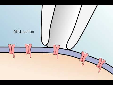 the patch-clamp method is used to study the properties of a small patch of membrane in this technique a glass pipette with a very small opening is used to make tight contact with a tiny area or patch of neuronal membrane after the application of a small amount of suction to the back of the pipette the seal between pipette and membrane becomes so tight that no ions can flow between the PI pad and the membrane thus all the ions that flow when a single ion channel opens must flow into the pipette the resulting electrical current though small